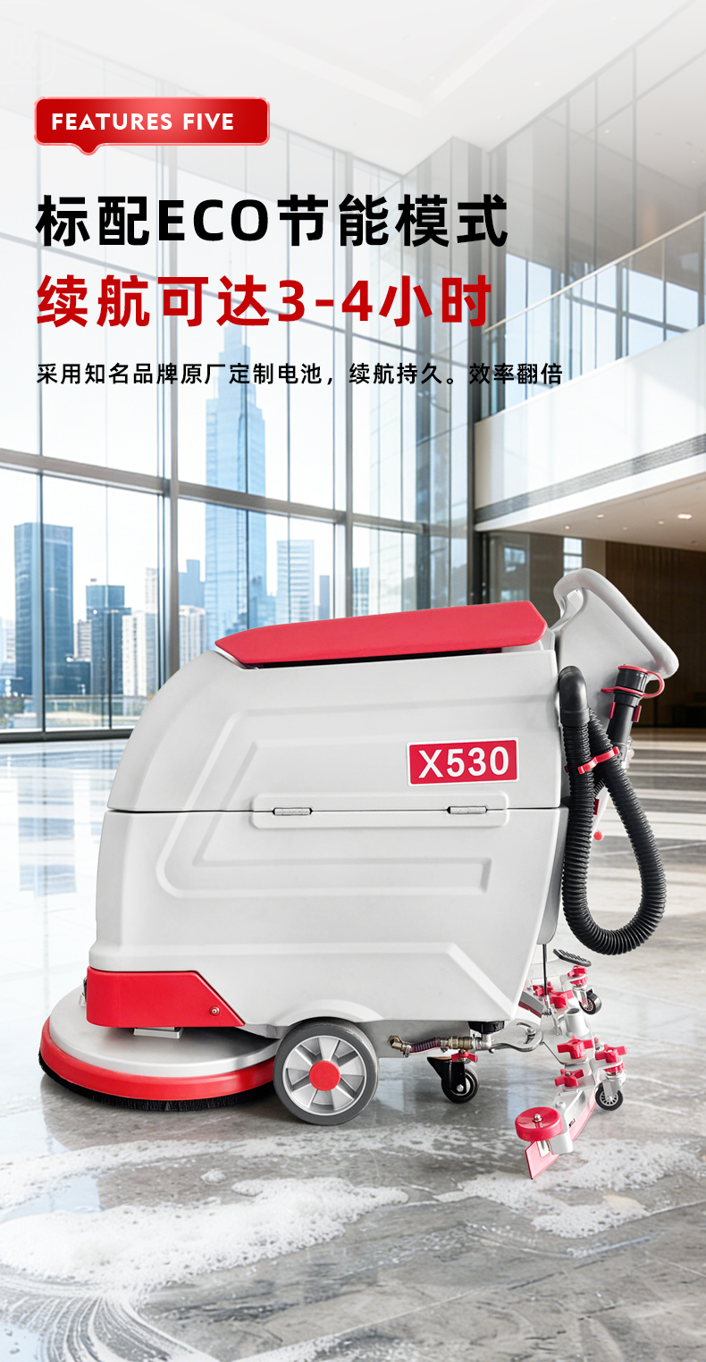 产品简介:利之星手推式洗地机X500整机设计美观大气,操作简单易上手,一台机器可代替5-6人,适用于物业、医院、工厂、仓库、机场、车库等小面积室内场景地面清洁作业。